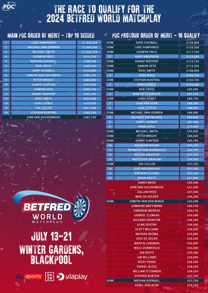 Las tablas muestran las últimas posiciones en la carrera hacia el Betfred World Matchplay, que se celebrará en el Winter Gardens de Blackpool del 13 al 21 de julio, transmitido por Sky Sports y los socios de transmisión global de la PDC.