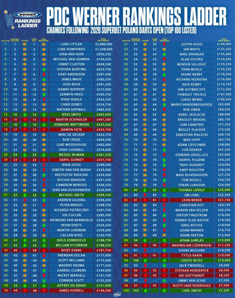 Por su parte, Luke Humphries mantiene firme la segunda posición mundial pese a la final alcanzada por Gian van Veenen el Poland Darts Open. Humphries fue subcampeón del World Masters y logró su primer título de Players Championship desde octubre de 2024 en el Evento Cuatro disputado en Wigan.